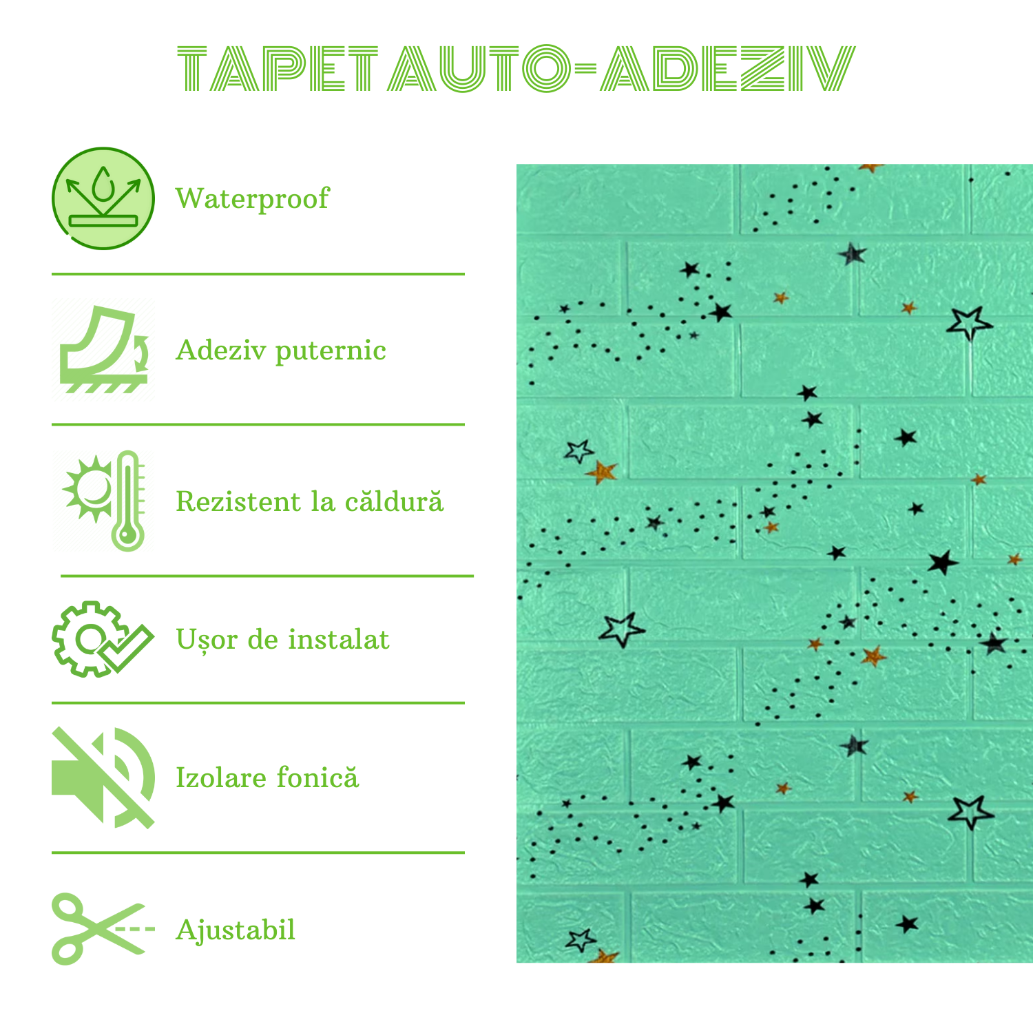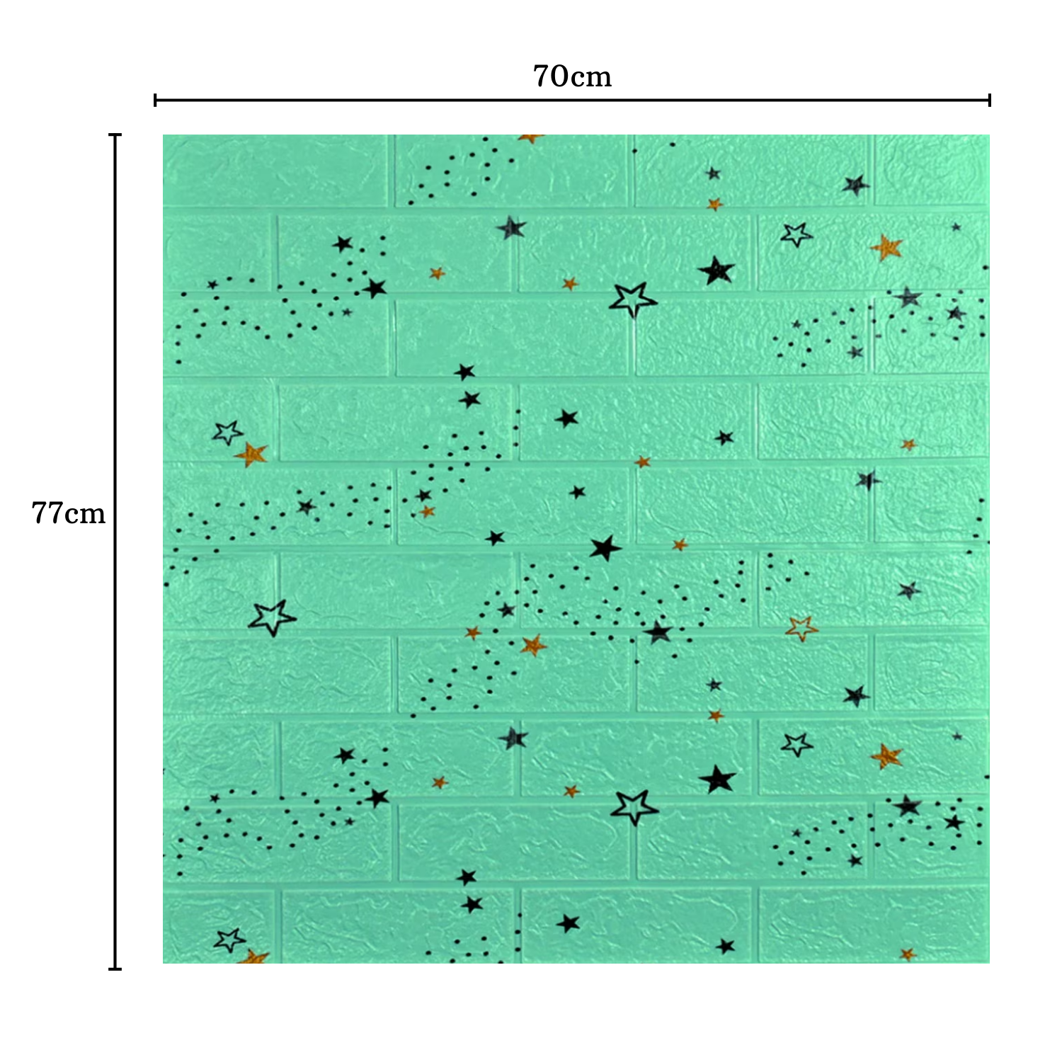 Set 10 Panouri Decorative Autoadezive 3D ZMR, 70x77 cm, Model 'Cărămidă Verde Mentă cu Stele Negre și Portocalii'